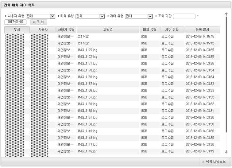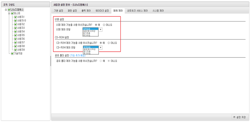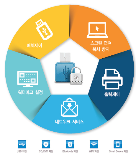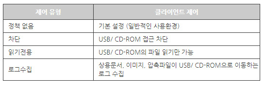 사용자 PC에서 사용하는 USB와 CD-ROM을 제어(차단, 읽기전용, 로그수집)하여 보안대상의 중요정보 유출을 방지합니다.